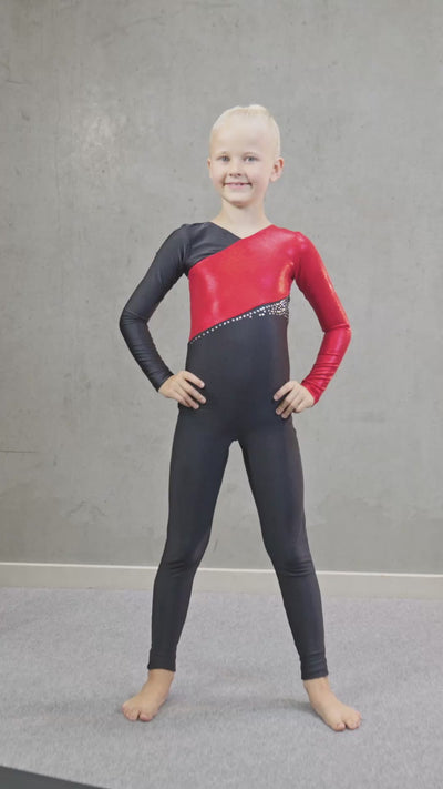 Trening møter konkurranse. Mange barn ønsker seg “en ekte gymnastikkdrakt” til den ukentlige treningen. Her har dere den. En gymnastikkdrakt med både glitter og paljetter som får gymnasten til å skinne i hallen. Heldrakt med lange ermer – perfekt for de tidvis kalde gymsalene.