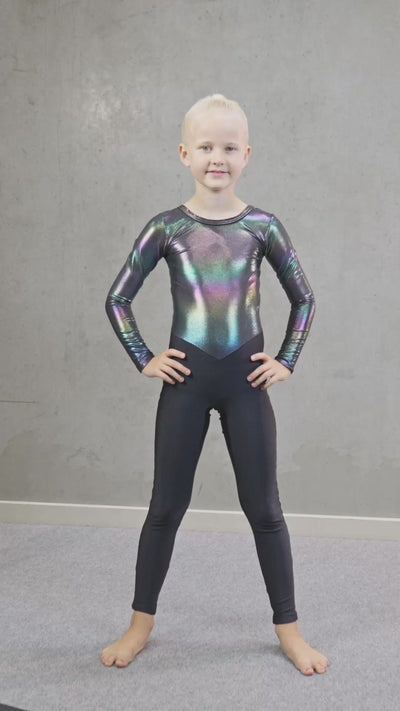 Trening møter konkurranse. Mange barn ønsker seg “en ekte gymnastikkdrakt” til den ukentlige treningen. Her har dere den. En gymnastikkdrakt med masse glitter. Heldrakt med lange ermer – perfekt for de tidvis kalde gymsalene.